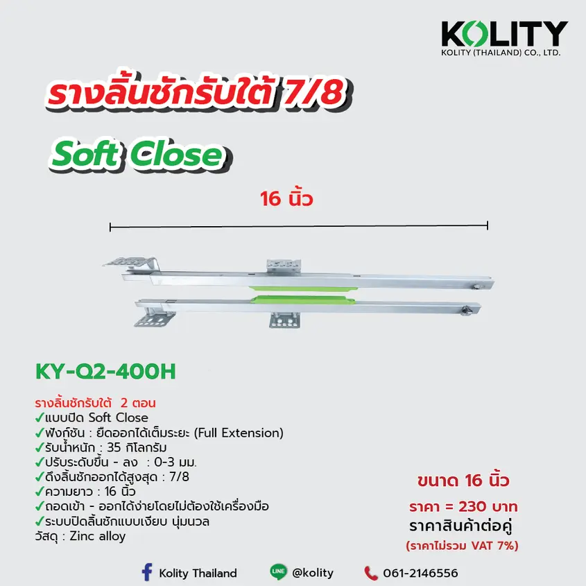 รางลิ้นชักแบบรับใต้ Kolity Thailand เป็นผลิตภัณฑ์ที่ช่วยเพิ่มความสวยงามและการใช้งานที่เงียบให้กับลิ้นชัก ด้วยการออกแบบที่ช่วยให้ลิ้นชักเลื่อนได้ลื่นไหลและเงียบ รางลิ้นชักแบบรับใต้จาก Kolity เหมาะกับลิ้นชักในตู้เก็บเครื่องใช้ในครัว หรือลิ้นชักในตู้เก็บเสื้อผ้าที่ต้องการดีไซน์เรียบง่าย ด้วยวัสดุที่แข็งแรงและทนต่อการใช้งานหนัก รางลิ้นชักแบบรับใต้ Kolity Thailand ช่วยให้ลิ้นชักเปิด-ปิดได้ง่ายและทนทาน ดีไซน์ที่ซ่อนรางไว้ใต้ลิ้นชักช่วยให้ตู้ดูสวยงามและทันสมัย